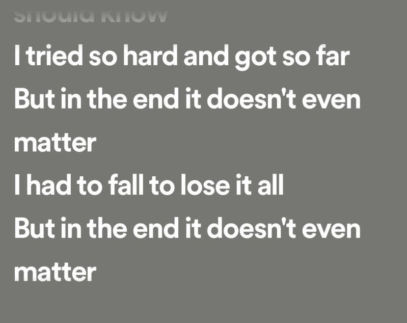 Het lijkt allemaal zo echt, ja ik weet het, ik begrijp het, maar dat is het niet. Til niet zo zwaar aan je keuzes, maak de keuzes waar jij blij van wordt, dat is het aller belangrijkste. In the end it doesn't even matter ๐